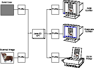 Figure 6-3 illustrates how a solid color and a scanned image are passed to the Java 2D API, and how they are displayed by various output devices. As you can see in Figure 6-3, both the input color and the image have profiles attached.