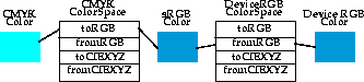 Though mapping through sRGB always works, it's not always the best solution. For one thing, sRGB cannot represent every color in the full gamut of CIEXYZ colors. If a color is specified in some space that has a different gamut (spectrum of representable colors) than sRGB, then using sRGB as an intermediate space results in a loss of information. To address this problem, the ColorSpace class can map colors to and from another color space, the "conversion space" CIEXYZ.The methods toCIEXYZ and fromCIEXYZ map color values from the represented color space to the conversion space. These methods support conversions between any two color spaces at a reasonably high degree of accuracy, one Color at a time. However, it is expected that Java 2D API implementations will support high-performance conversion based on underlying platform color-management systems, operating on entire images. (See ColorConvertOp in "Imaging" on page 67.)