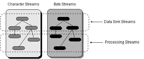 Reading Writing open a stream while more information read information close the streamopen a stream while more information write information close the streamjava.iopackage contains a collection of stream classes that support these algorithms for reading and writing. These classes are divided into two class hierarchies based on the data type (either characters or bytes) on which they operate.