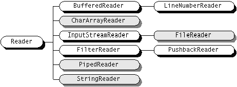 ReaderandWriterimplement specialized streams and are divided into two categories: those that read from or write to data sinks (shown in gray in the following figures) and those that perform some sort of processing (shown in white). The figure shows the class hierarchies for theReaderandWriterclasses.