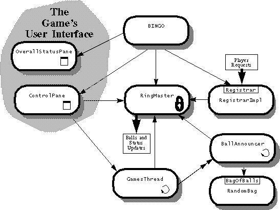 mainmethod also creates three other objects: aRegistrarImplobject (which handles all RMI requests from Players), and aControlPaneand anOverallStatusPane(both of which implement parts of the Game's user interface).When the user clicks the Let the Games Begin button, the