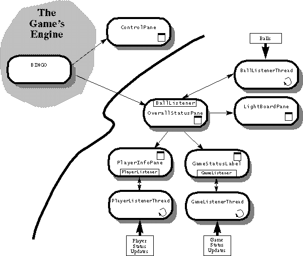 Click the image to view it at its natural size.bingo.gamepackage. The classes below and to the right of the swoosh are in thebingo.sharedpackage because they do not depend directly on any code in the Game and they can be shared by the Player (asLightBoardPaneandGameStatusLabelare).The best way to understand the classes that make up the Game's UI is to identify the areas of the user interface that each class controls. So, here's a box diagram that shows you what class controls each area of the Game's user interface: